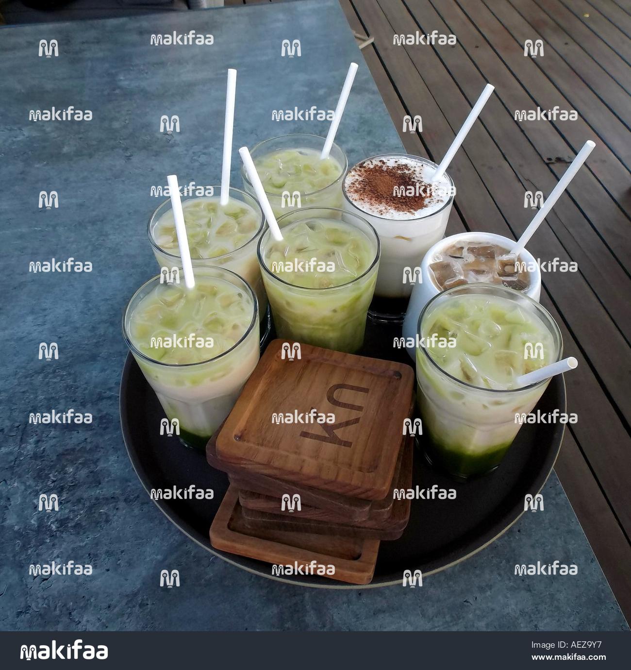 Vinywaji vinne(chai ya maziwa ya rangi, vinywaji baridi vya kijani kibichi na kahawa) kwenye sahani yenye majani na sahani ndogo za mbao za Kivu Noir.